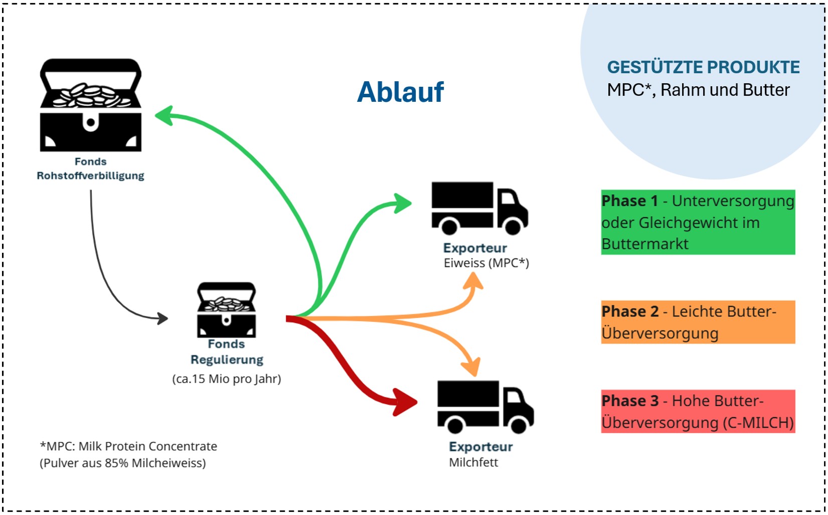 Stützung der Exporte von Milchfett oder Milcheiweiss (MPC) bei Überschüssen. Ohne diese Massnahme würde der Milchwert auf Dauer sinken. Der Fonds stabilisiert den Markt.
