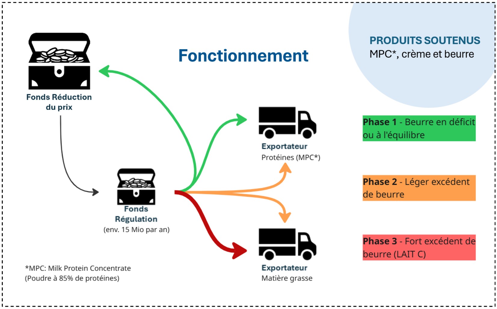 Le fonds de "Régulation" soutient les exportations de graisse lactique ou de protéines (MPC) lors d’excédents. Sans intervention, la valeur du lait chuterait durablement. Le fonds stabilise le marché.
