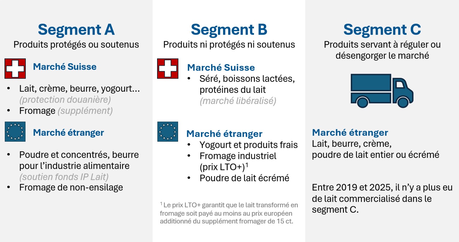 Le prix du lait acheté pour fabriquer des produits protégés ou soutenus face à la concurrence étrangère doit s’aligner sur les prix suisses. C’est le segment A.
